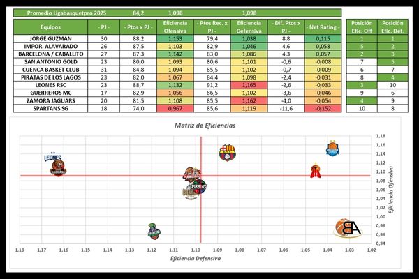 El equipo Jorge Guzmán se destacó como el conjunto más eficiente de la temporada, con una eficiencia ofensiva de 1,153 y una defensiva de 1,038, logrando el mejor Net Rating (+0,115).