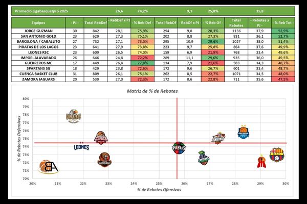 El Jorge Guzmán volvió a sobresalir también en esta área, liderando con 37,9 rebotes por partido y un impresionante 28,3% en rebotes ofensivos.Detrás se ubicaron Barcelona/Caballito y San Antonio Gold, ambos con promedios por encima de las 36 capturas por juego.