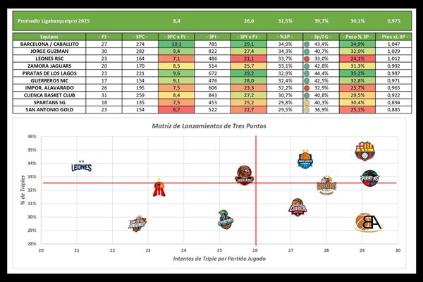 Barcelona/Caballito fue el equipo más efectivo desde el perímetro, con 34,9% de acierto y 10,1 triples por encuentro, seguido por Jorge Guzmán y Zamora Jaguars.