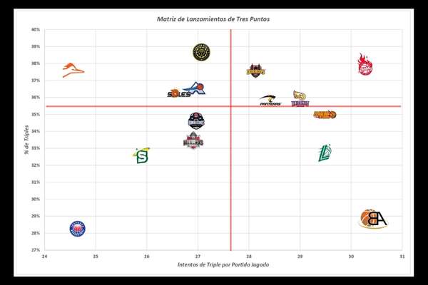 El 35,5% de los lanzamientos provinieron desde el triple, con un promedio de 9,8 conversiones por partido. Diablos Rojos (38%) y Fuerza Regia (38,7%) fueron los más efectivos, mientras que Freseros cerró en el fondo con 28,3%.